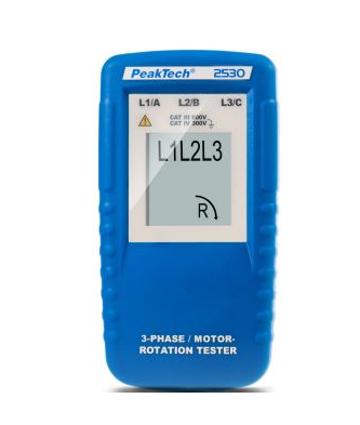 Pentru a conduce motoare trifazate și motoare de curent alternativ cu pornire automată, un câmp rotativ într-un circuit trifazat trage magnetic rotorul unui motor electric. Acest lucru se poate face ca un câmp invartitor la dreapta sau la stânga, cu un schimb de doi conductori exteriori ai circuitului trifazat provoacă o inversare a acestui sens de rotație. PeakTech 2530 este un dispozitiv de măsurare care verifică fazele unui motor trifazat și arată direcția curentă de rotație. În acest fel, motoarele electrice pot fi conectate corect în timpul instalării noi sau pot fi găsite erori în sistemele existente. Acest lucru face din PeakTech 2530 însoțitorul ideal pentru orice instalator electric sau tehnician de service, de ex. în întreţinerea instalaţiilor industriale sau instalarea bucătăriilor comerciale.