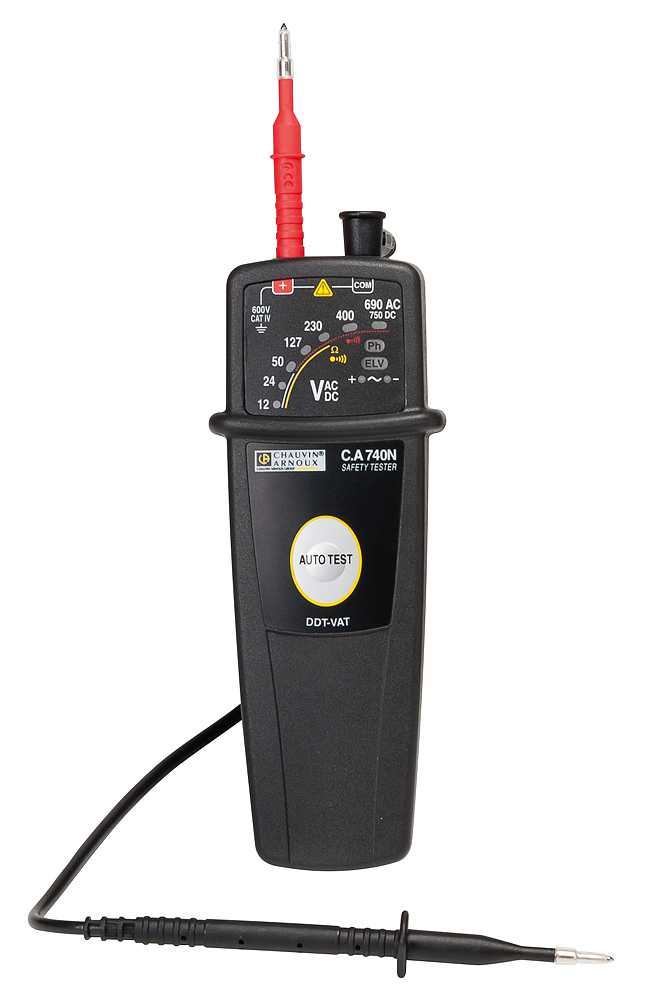 Testerul de absenta de tensiune C.A 740N este o unealta esentiala pentru orice electrician pentru a verifica absenta tensiunii inainte de a lucra pe o instalatie electrica. In conformitate cu IEC 61243-3 Editia 2, poate fi folosit pe orice instalatie 600 V CAT IV de interior sau exterior. Pentru a indeplini cerintele din standardele si legislatia din anumite tari exista doua referinte, cu sau fara accesorii IP2X. C.A 740N este echipat cu un sistem de siguranta redundant in cazul unor defectiuni de alimentare, LED ELV care se aprinde oricand tensiunea depaseste 50 VCA / 120 VCC. Autotestul complet verifica circuitele electrice, alimentarea, display-ul si conditia cablurilor de masurare. Cablurile si sonda de testare sunt detasabile. Accesoriul C.A 751 de masurare poate fi folosit pentru a testa prize 2P+E rapid si usor.