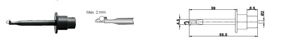 Clips carlig din aliaj de cupru pentru prinderea picioarelor IC, pinii conectorilor si conexiunile de fire neizolate. Obiectele prinse sunt presate pe varful izolatorului sub presiunea arcului. Greutatea scazuta a clipsului impune aproape nici o sarcina chiar si asupra contactelor critice. Mufa rigida Ø 2 mm in izolator.